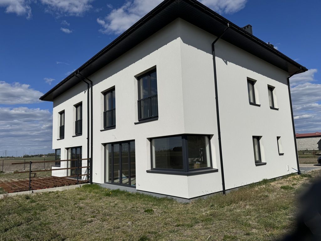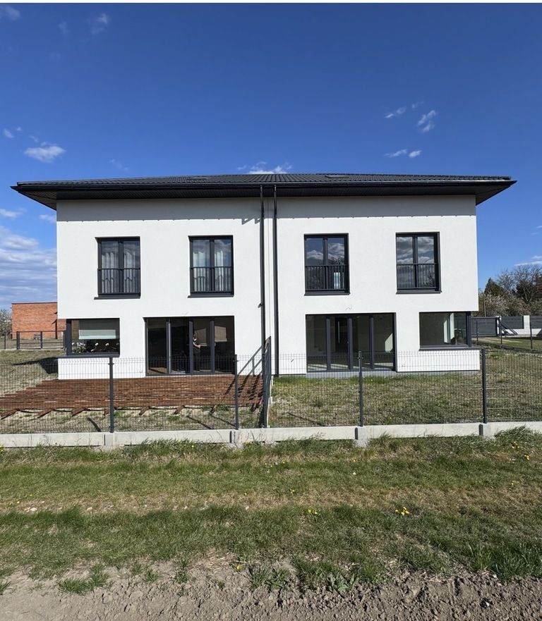 Modern semi-detached house with a large garden (200 m²), finished in bright, pleasant tones. Functional layout with a garage integrated into the building structure.