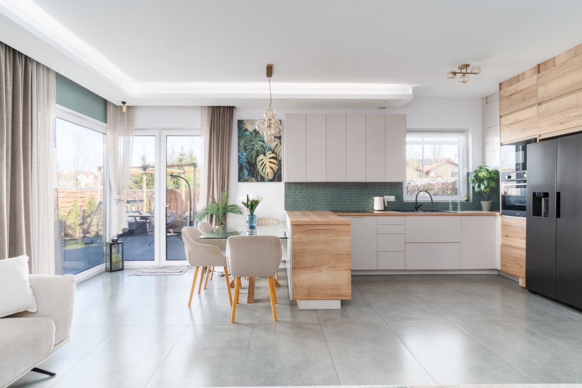 - duży salon z kuchnią - 31,64 m2 , wyjście do ogródka - 95m²