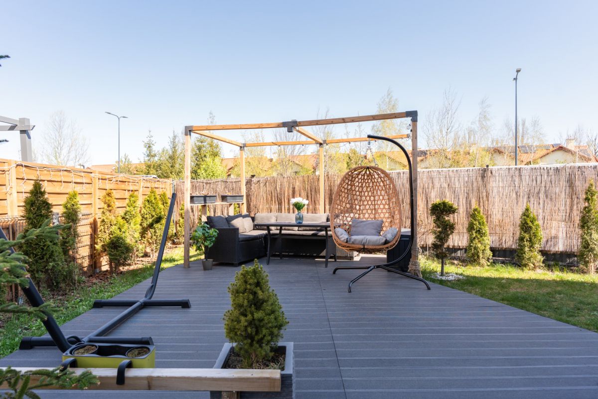 Wokoło dużo zieleni, miejsce do odpoczynku i grillowania, miejsce do gry w piłkę lub zabawy dla dzieci.