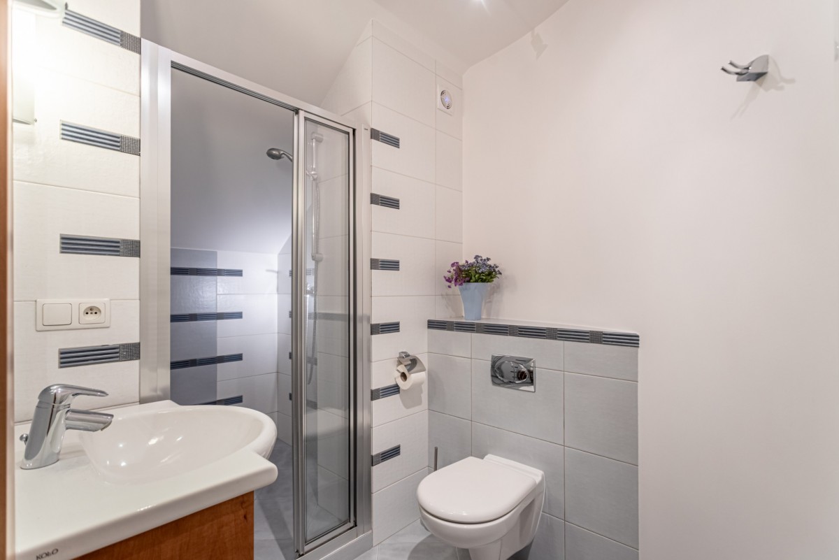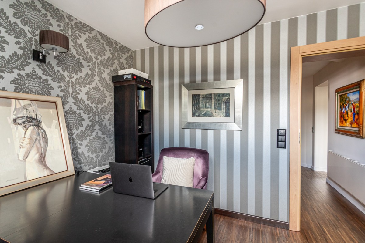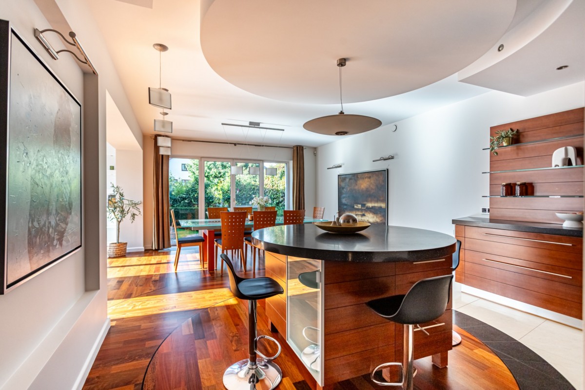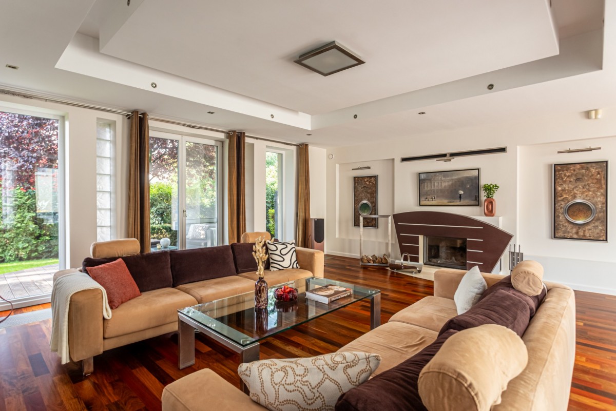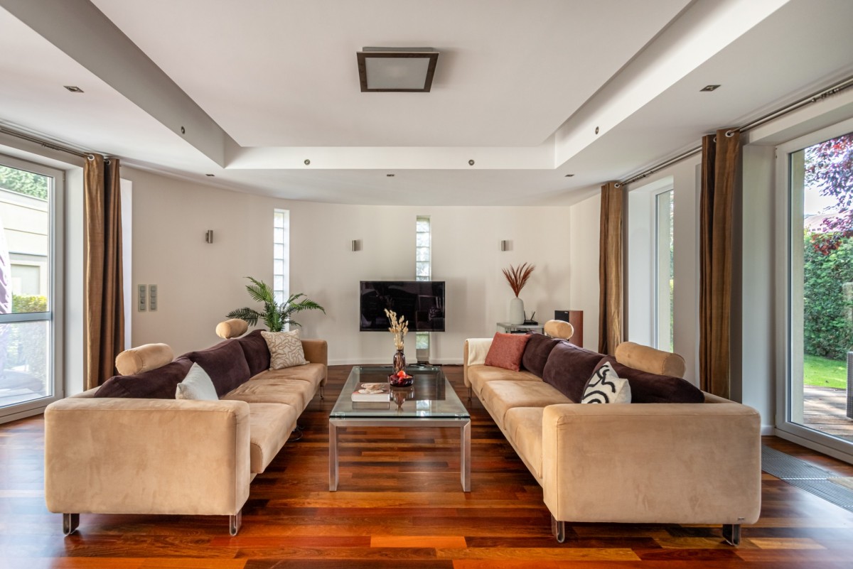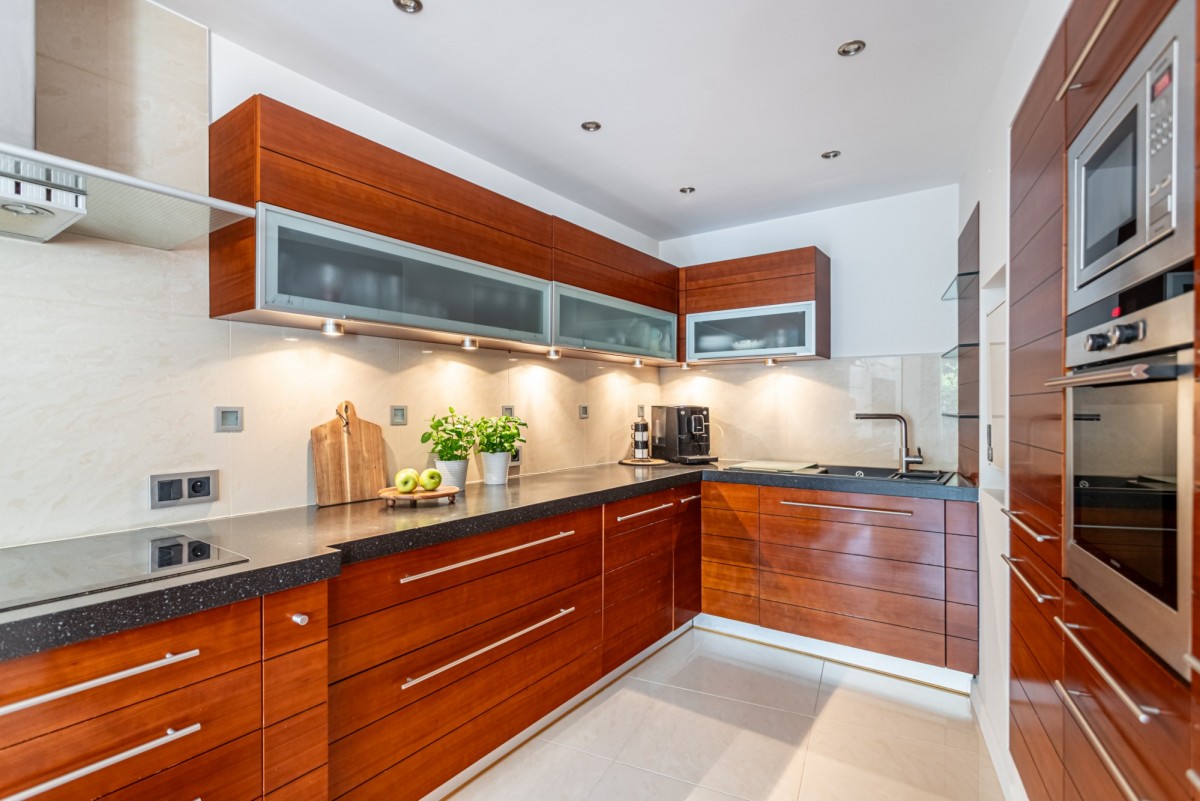 Wnętrza wykończono w ponadczasowym stylu. Egzotyczne drewno i gres na podłogach, gładzie i tapety na ścianach tworzą tutaj eleganckie tło dla wyposażenia. Ogrzewanie gazowe z nowoczesnym piecem oraz kominek w salonie zapewniają ciepło i przytulność przez cały rok. Trzy tarasy z meblami wypoczynkowymi zachęcają do spędzania czasu na świeżym powietrzu, a ogród z automatycznym systemem podlewania gwarantuje piękny widok bez wysiłku.