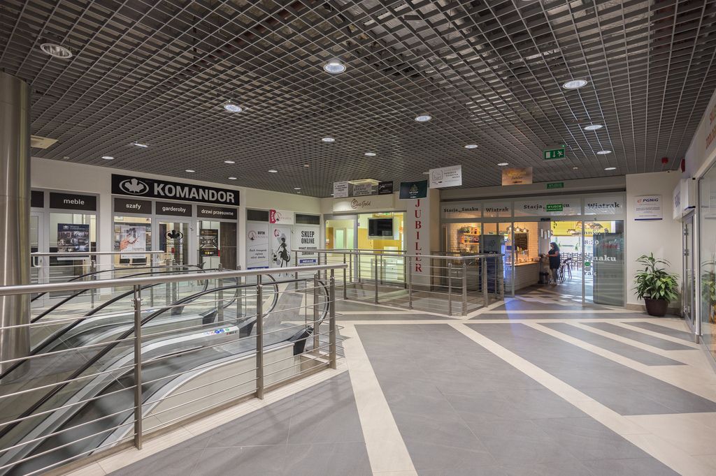 Lokal jest w pełni wyposażony wg. projektu renomowanej pracowni architektonicznej (możliwość przekazania kompleksowego projektu z inwentaryzacją kupującemu), meble, witryny z przeszkleniami na wymiar, wyspa w sali sprzedaży podświetlane LED. Ekrany LCD w sali sprzedaży z przeznaczeniem pełnienia funkcji dodatkowych nośników reklamowych (1 widoczny z zewnątrz, 1 widoczny od wewnątrz). Na ścianach tapeta, na podłogach wysokiej jakości gres, designerskie oświetlenie. Nowoczesna instalacja elektryczna z systemem zabezpieczeń, alarmem, zabezpieczeniami przeciwpożarowymi z czujnikami dymu i zraszaczami, monitoringiem. Przeszklona witryna z przygotowanym miejscem na powierzchnię reklamową (np. logo firmy). W pełni wyposażone zaplecze socjalne z kuchnią oraz WC dla personelu. Oddzielne pomieszczenie z dodatkowymi zabezpieczeniami - kantor z pancernymi szybami i drzwiami spełniającymi rygorystyczne normy towarzystw ubezpieczeniowych. W lokalu do 2021 roku znajdował się salon jubilerski z ekskluzywną biżuterią. Lokal idealny do prowadzenia działalności gospodarczej handlowej lub usługowej. Położony w miejscu o dużym natężeniu ruchu bezpośrednio przy schodach ruchomych (każdy klient galerii wjeżdża na I piętro na wprost lokalu), obok dobrze prosperująca restauracja, biuro obsługi PGNiG, punkt handlowy Szafy i Zabudowy Komandor, ponadto w Galerii - Banki, Auchan, kawiarnia, cukiernia liczne punkty handlowe, usługowe, salony piękności, Fitness.