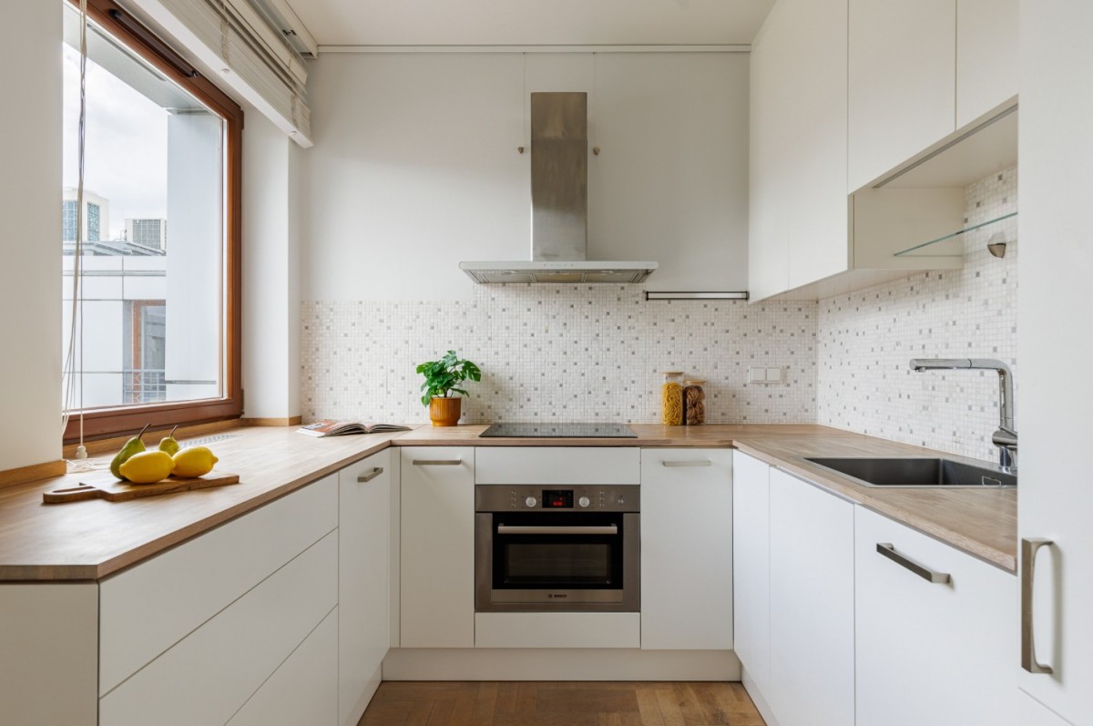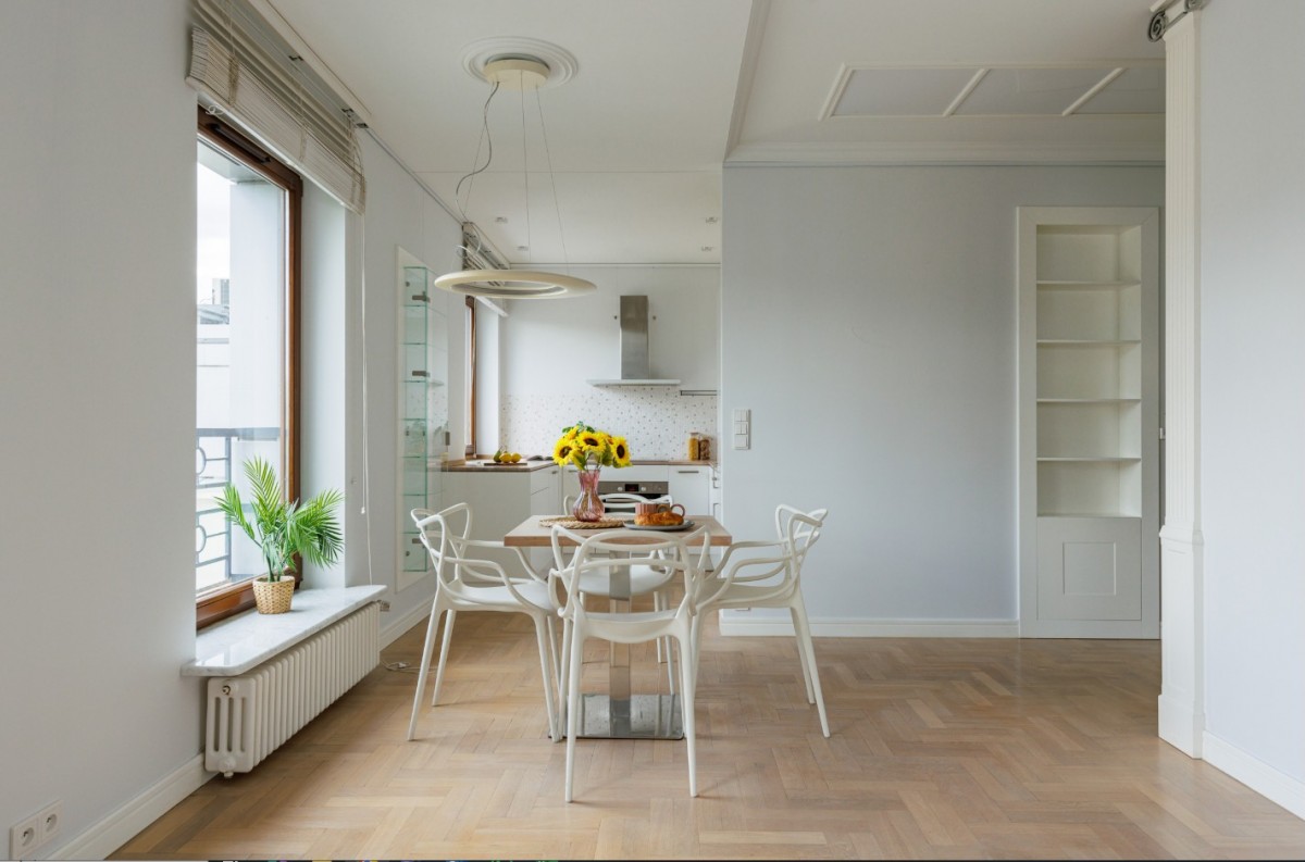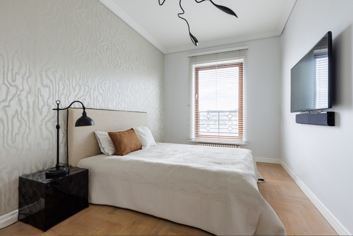 Mieszkanie o powierzchni 52 m2 znajduje się na ostatnim piętrze, na które wjazd windą, możliwy jest wyłącznie przy pomocy specjalnej karty magnetycznej (jedyny lokal na tej kondygnacji). Układ pomieszczeń: duży pokój połączony z otwartą kuchnią, sypialnia, łazienka z prysznicem i toaletą hall i korytarz, na całej długości zabudowane szafami. Obok wejścia do sypialni zaaranżowane zostało miejsce do pracy. Mieszkanie w stanie do odświeżenia / remontu. Na podłodze w pokojach, przedpokoju i kuchni położony jest dąb bielony a w łazience kamień. Sprzęt AGD w kuchni firmy Bosch (płyta indukcyjna, piekarnik z mikrofalą, lodówko - zamrażarka, zmywarka, okap), w salonie zestaw kina domowego. W mieszkaniu jest dużo okien co w połączeniu z ostatnim piętrem sprawia, że wnętrze jest bardzo dobrze doświetlone. Dodatkowo z okien rozciąga się ładny widok ponad dachami sąsiednich budynków. Do mieszkania przynależy wygodne miejsce garażowe i komórka lokatorska.