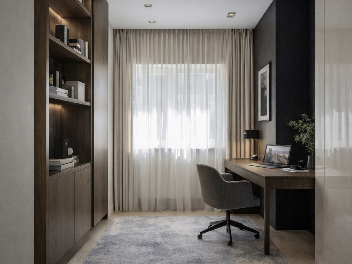 Dzięki temu mieszkanie może zostać zorganizowane nawet jako cztery funkcjonalne strefy: salon, sypialnia, gabinet oraz osobna kuchnia — w zależności od indywidualnych potrzeb przyszłego właściciela.