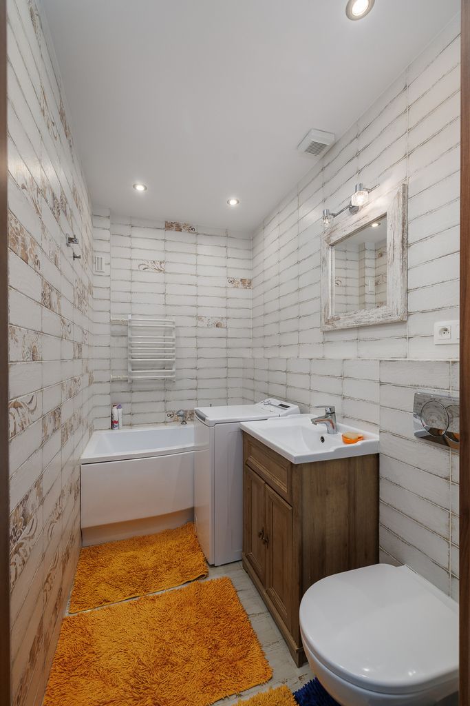 Na podłogach w całym mieszkaniu są panele oraz terakota. Na ścianach tynki, a w łazience glazura i terakota.