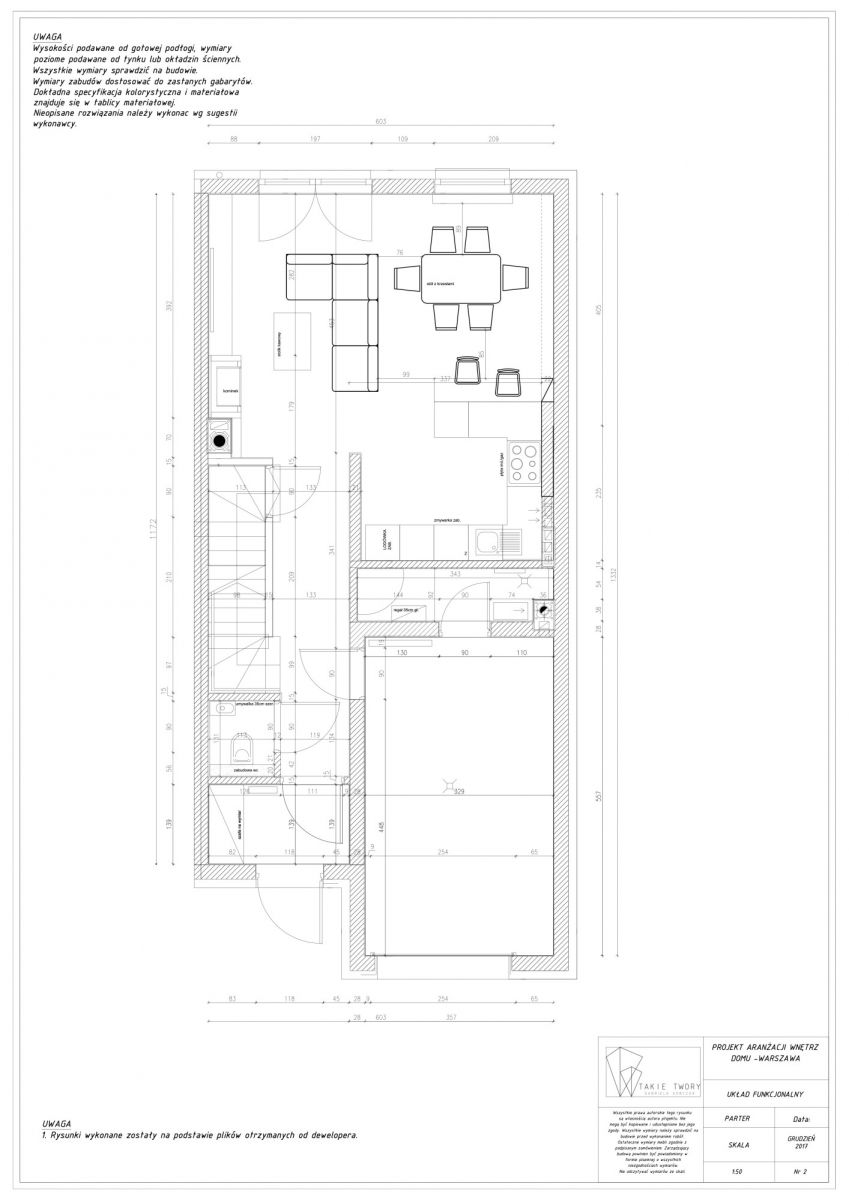 Parter: przestronny salon z kominkiem, jadalnia z otwartą kuchnią w zabudowie, spiżarnia, toaleta, wiatrołap z szafą; wyjście na ogród (50 m²)