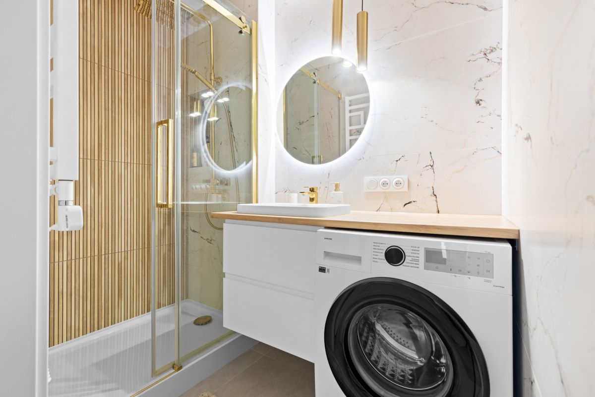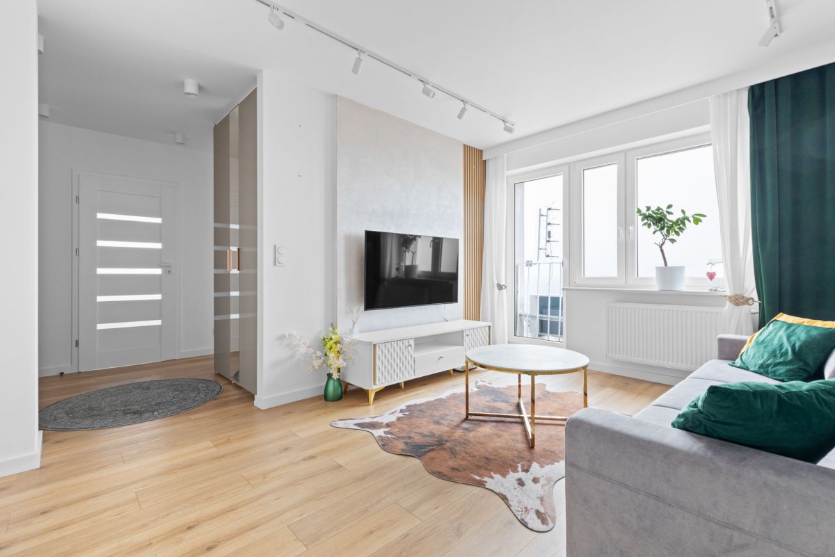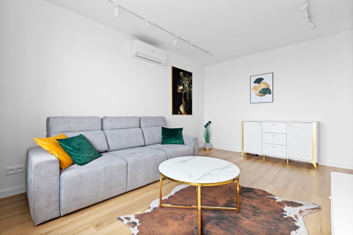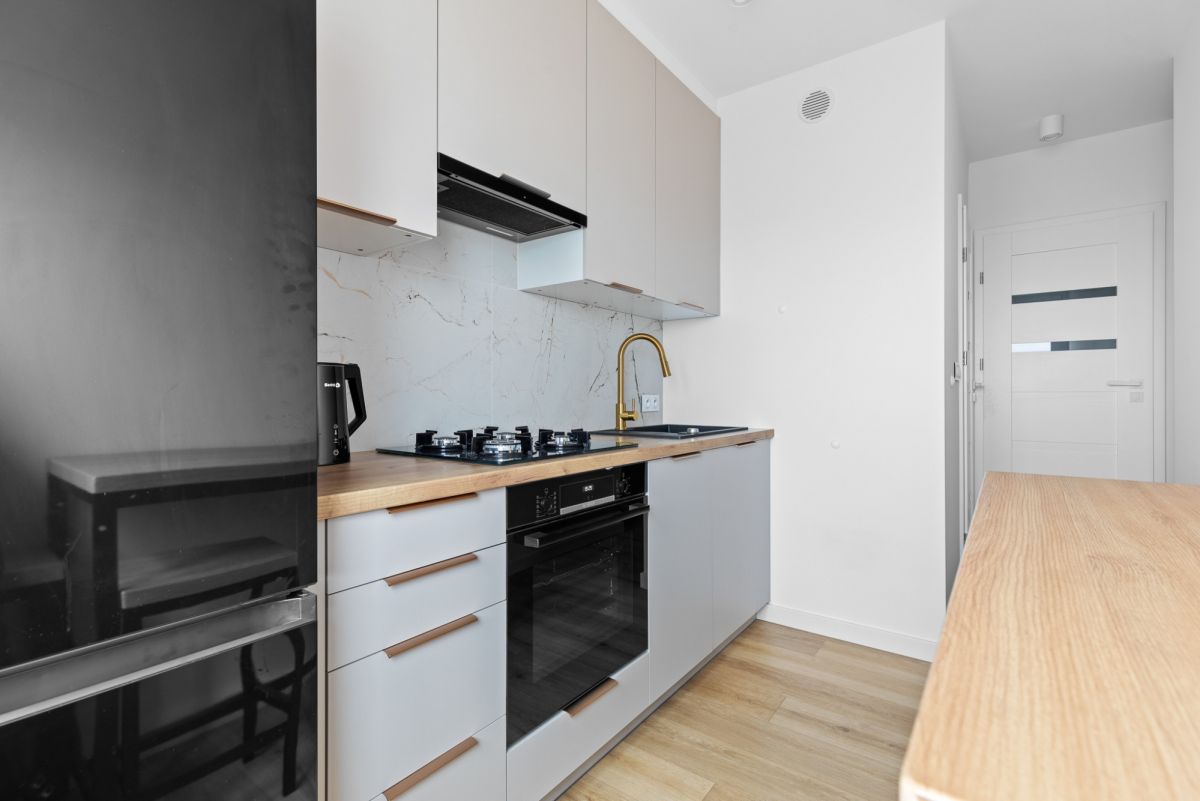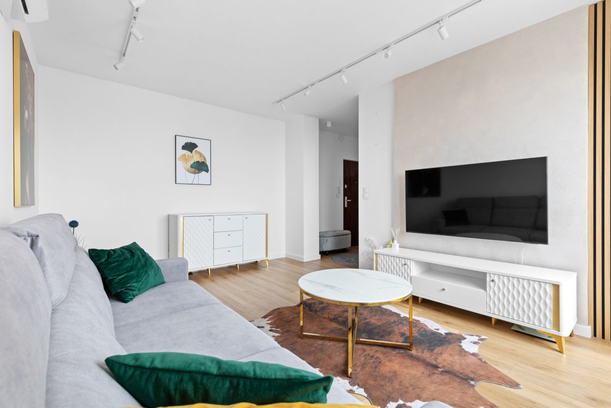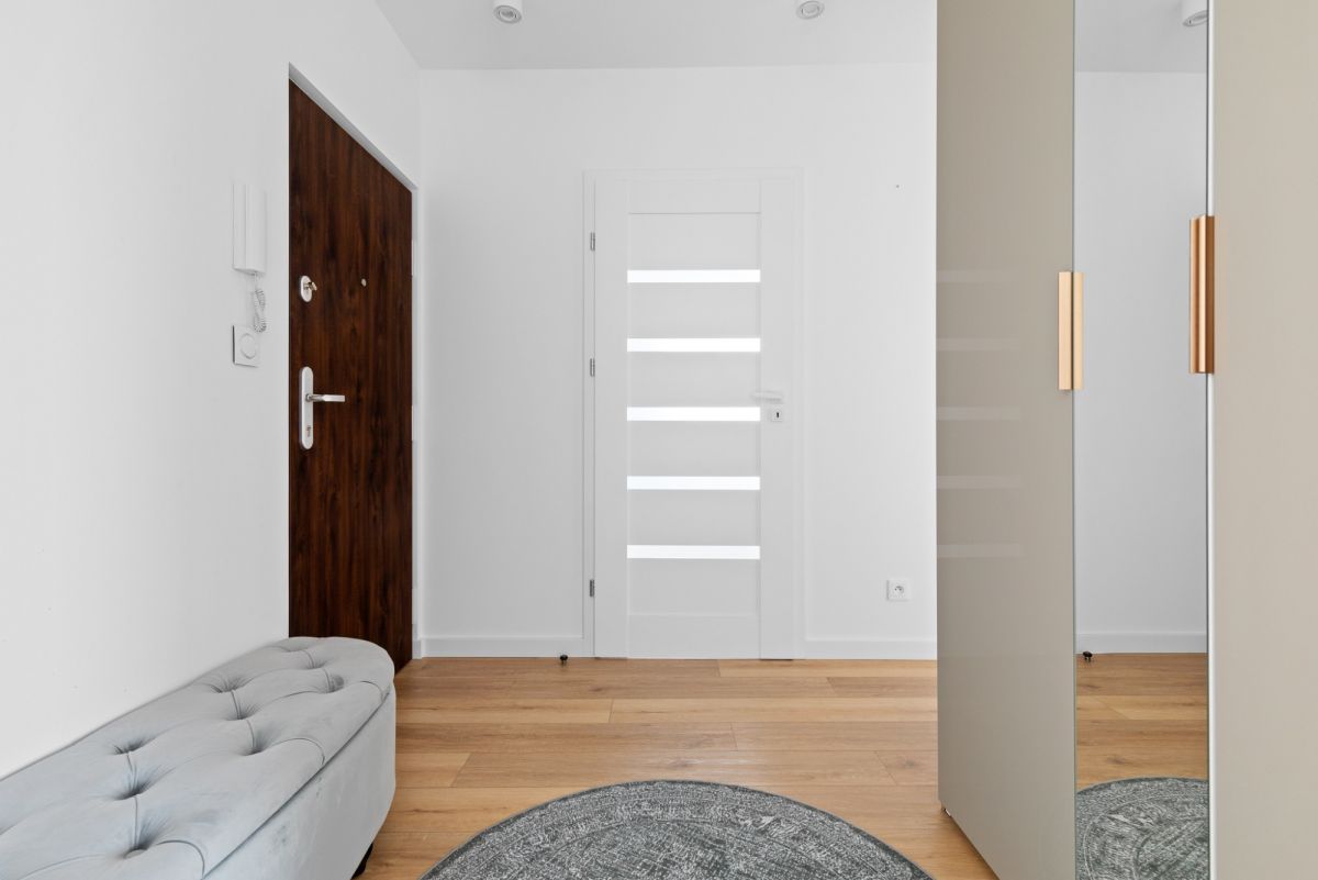 Mieszkanie jest w pełni wyposażone we wszystkie meble, sprzęty AGD (pralka, zmywarka, kuchenka z piekarnikiem, okap, chłodziarko-zamrażarka), w łazience kabina prysznicowa, osobne WC, w przedpokoju szafa z dużą ilością przestrzeni do przechowywania.