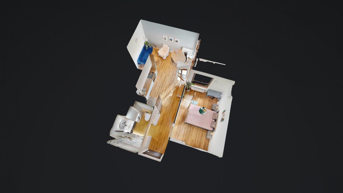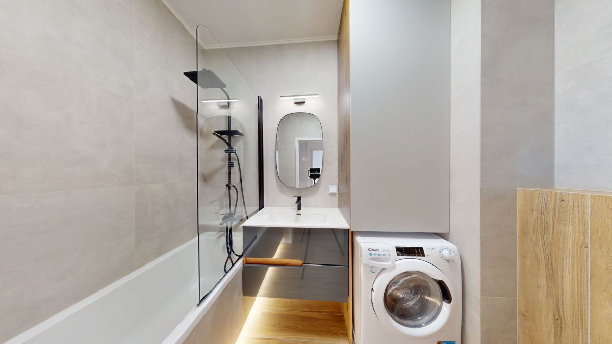 - Łazienka - z wanną z funkcją prysznica, pralką i estetyczną zabudową.