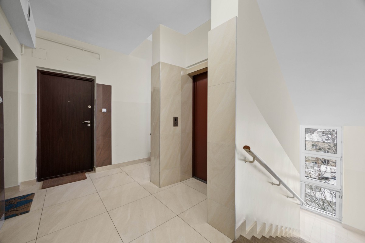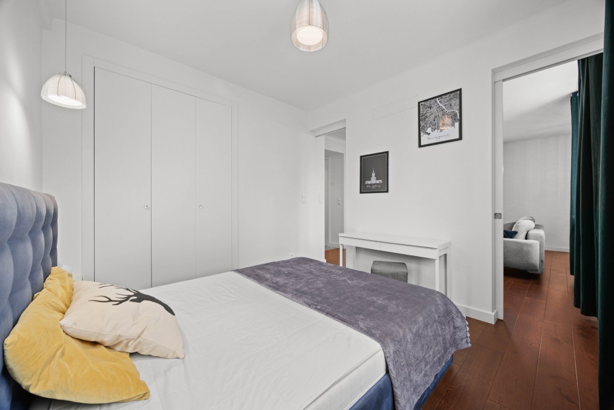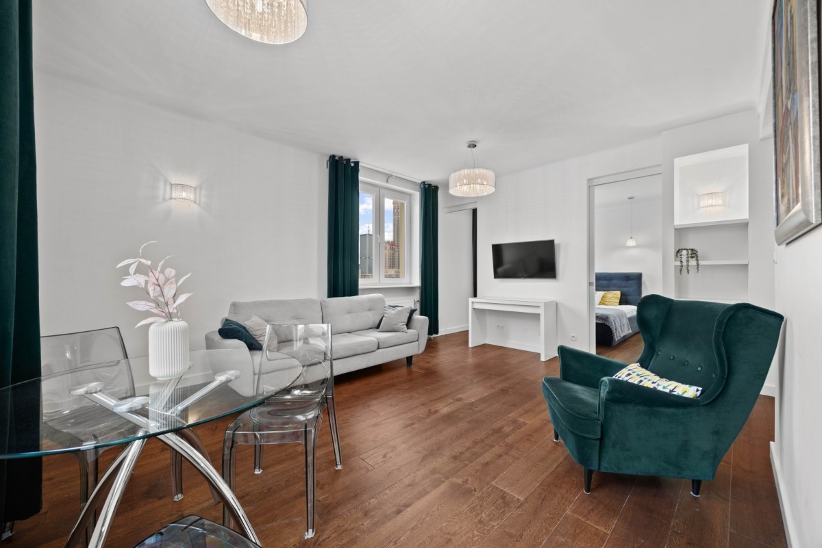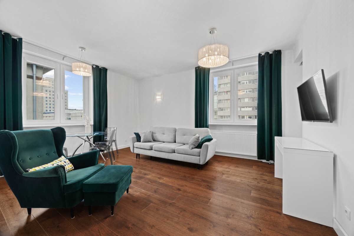 Powierzchnia mieszkania wynosi 50,50 m2 i znajduje się na VI piętrze w kamienicy. Składa się z pokoju dziennego, oddzielnej kuchni, sypialni, łazienki i przedpokoju. Kuchnia jest wyposażona w meble oraz w sprzęt AGD tj. lodówkę, piekarnik, płytę indukcyjną, okap, zmywarkę. W salonie znajduje się wygodna sofa, stolik kawowy, telewizor oraz wygodny fotel. Z salonu bezpośrednio niezwykły widok na PKiN. W sypialni jest łóżko o szerokości 160 cm oraz duża szafa w zabudowie. W łazience jest nowy natrysk, szafki. Dodatkowy schowek na pralkę i pranie. W przedpokoju znajdują się dwie bardzo duża szafy, które mogą pełnić funkcję garderoby.