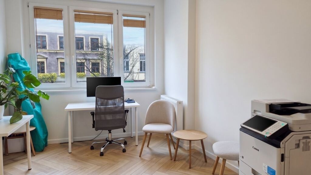 Lokal obecnie jest nieumeblowany (zdjęcia prezentują aranżację poprzedniego biura), co pozwala na dowolną aranżację stanowisk pracy lub strefy obsługi klienta. Wyposażony w wydajną klimatyzację i szybki internet w cenie.