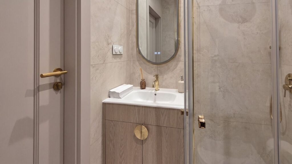 Zaplecze: Oddzielna, w pełni wyposażona kuchnia z nowym AGD oraz nowoczesna łazienka z prysznicem.