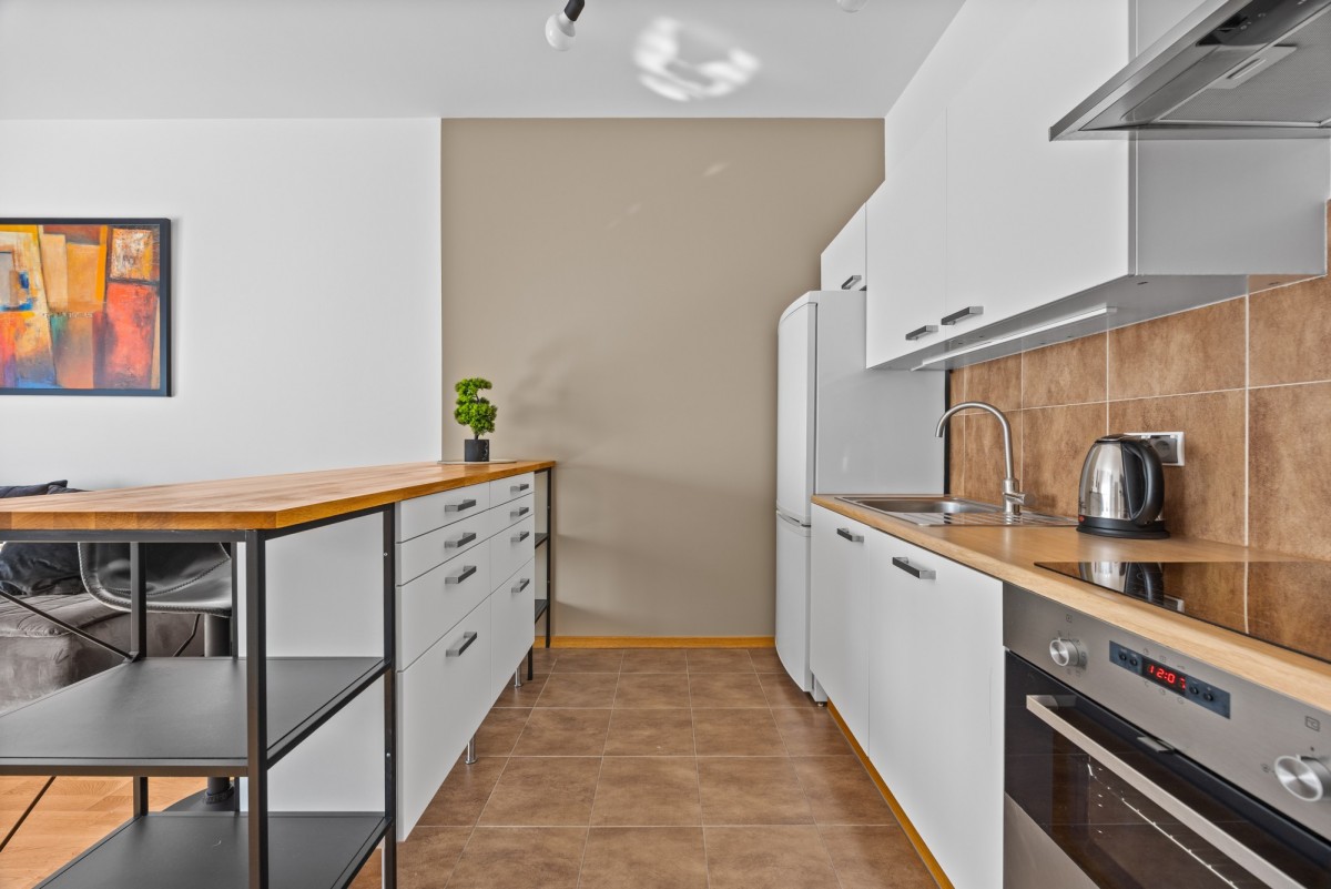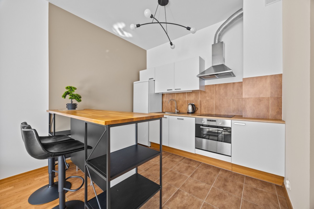 • Aneks kuchenny wyposażony w sprzęt AGD — kuchenka, piekarnik, lodówka, okap.