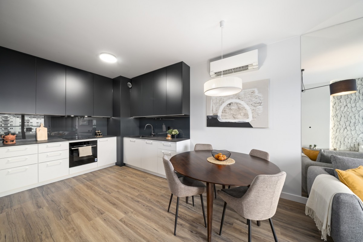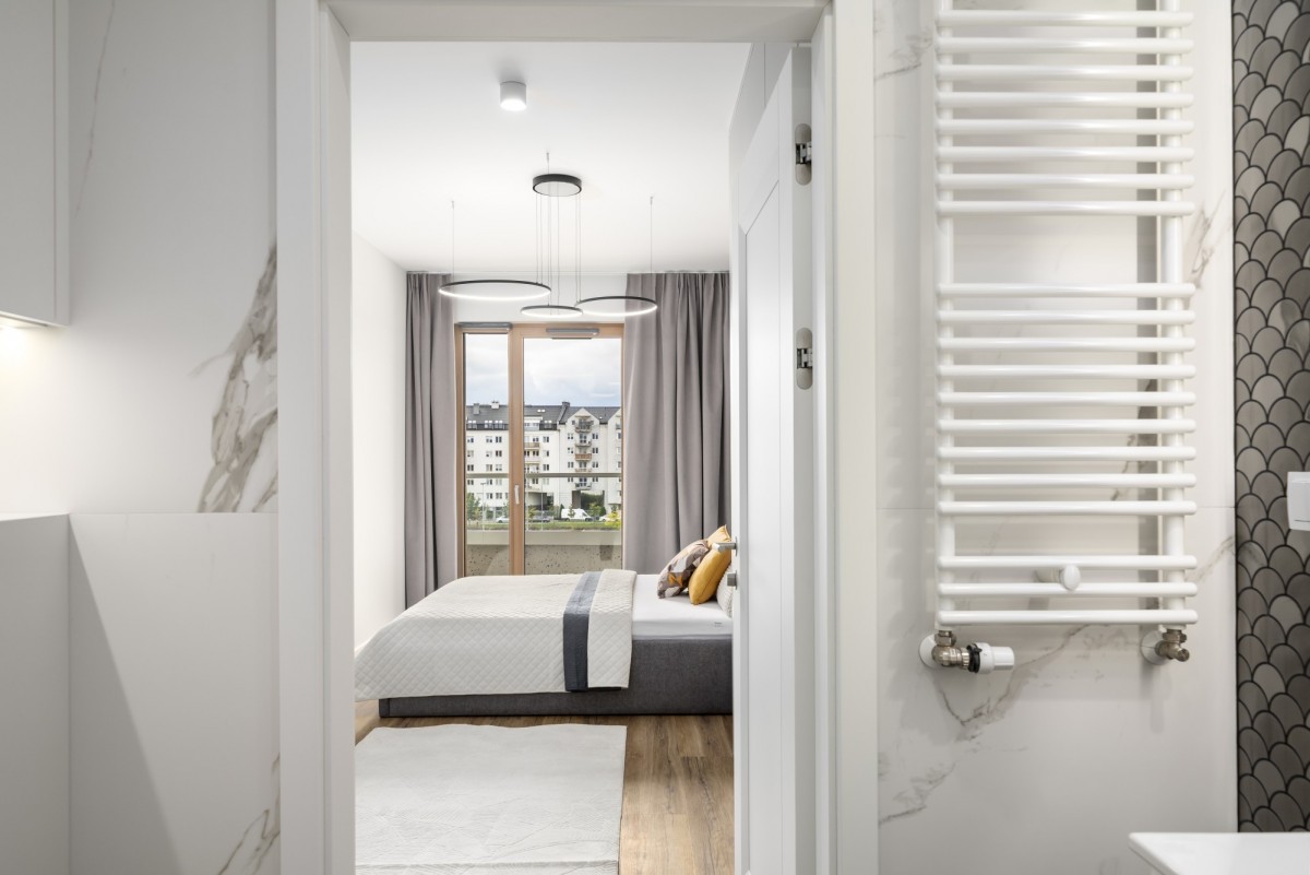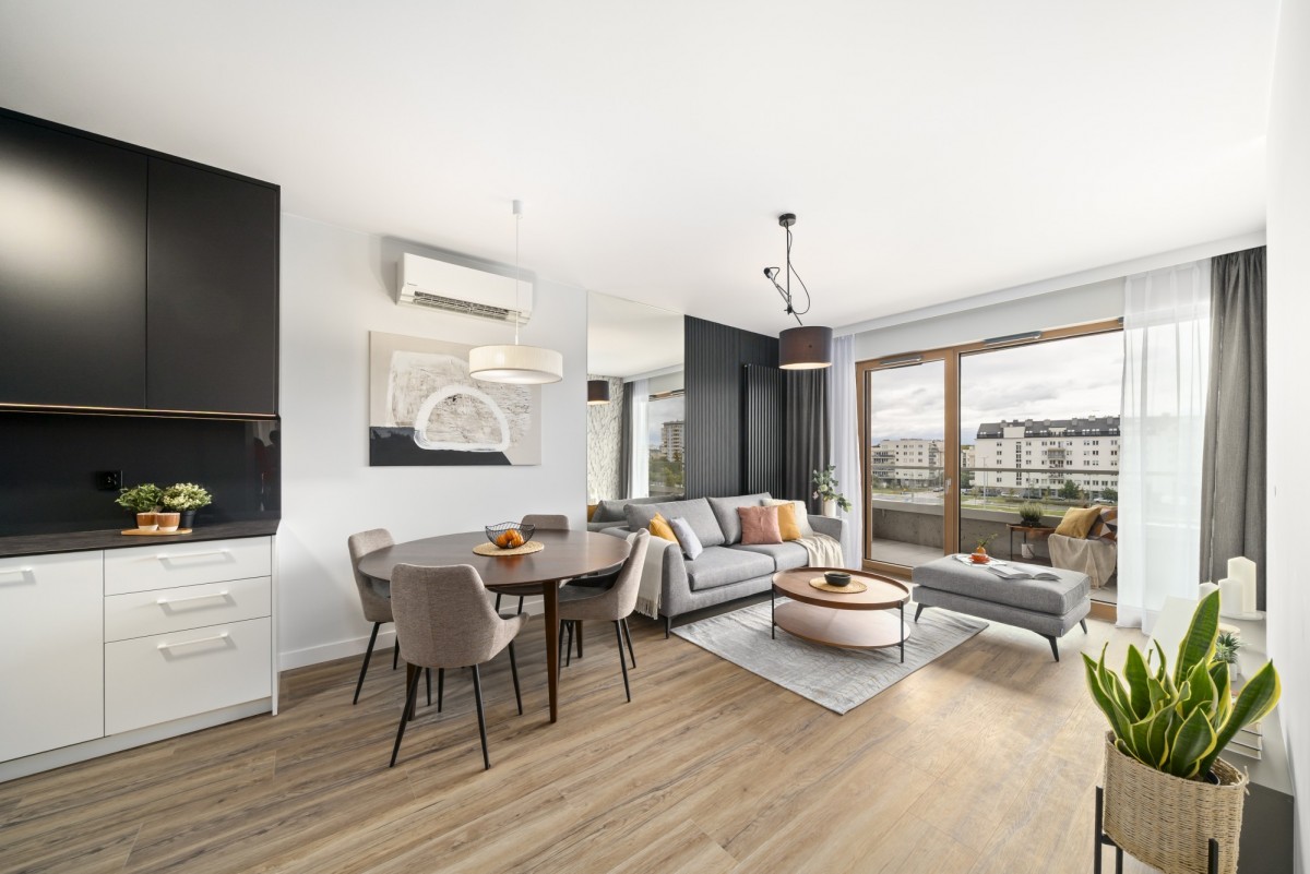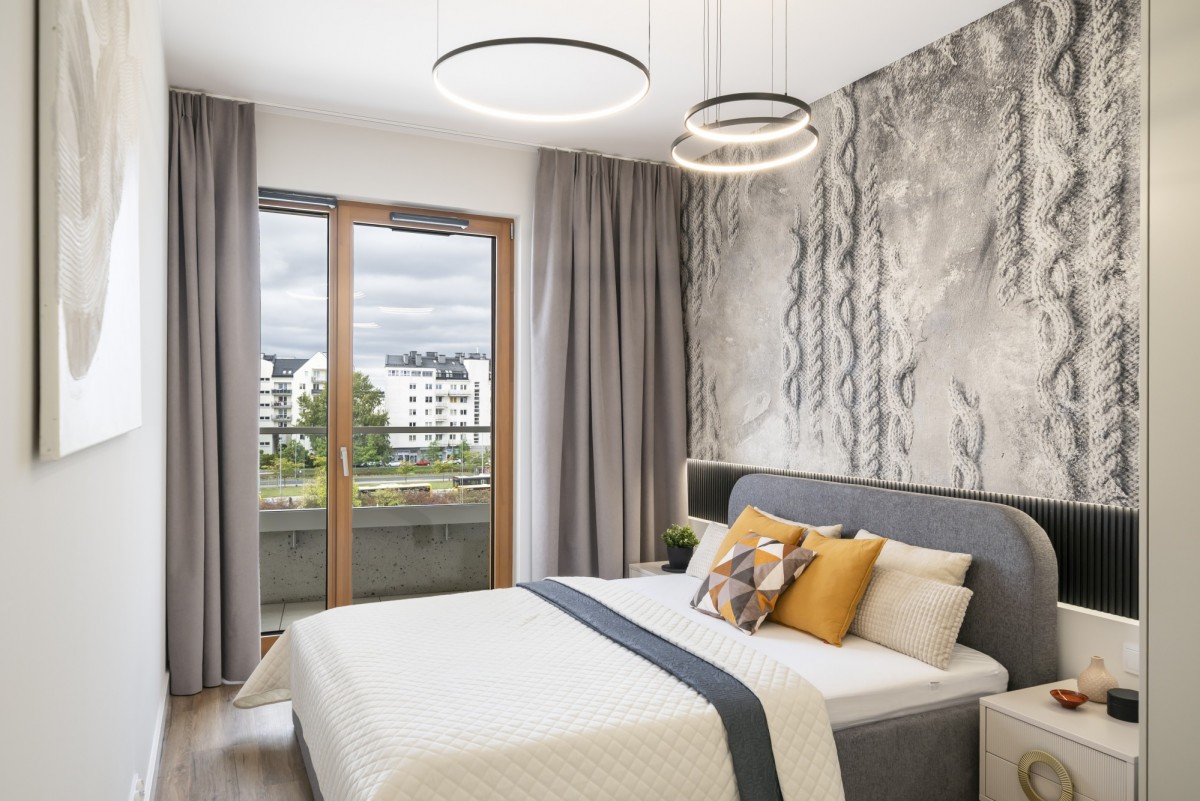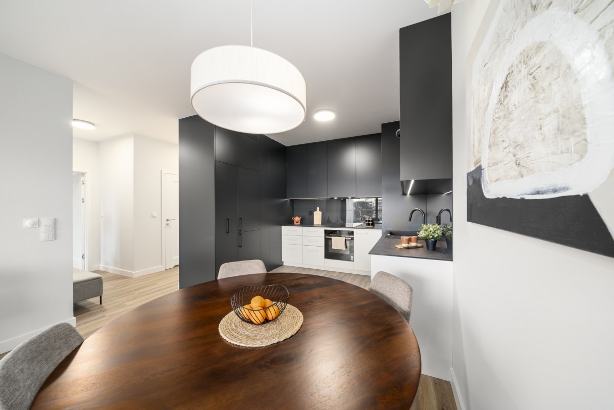 Salon z otwartą kuchnią i jadalnią umeblowany, główna sypialnia umeblowana, druga sypialnia (alternatywnie gabinet, pokój dziecka/nastolatka lub pokój gościnny) umeblowana, w tym zabudowa stała szaf ściennych na wymiar, telewizor na zapytanie najemcy.
