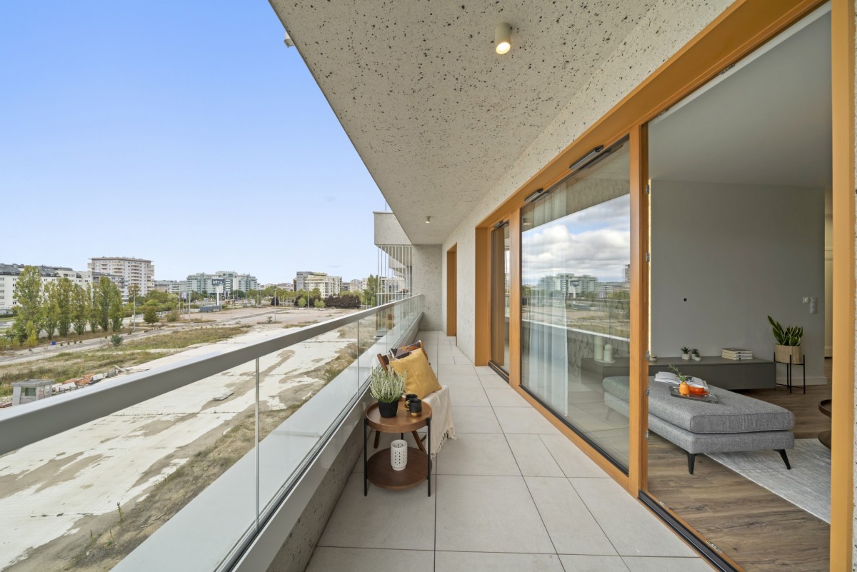 Okna i drzwi loggi od strony zachodniej zapewniają dużo światła we wszystkich przylegających do balkonu pokojach (salon, gabinet, główna sypialnia). Wyjścia ze wszystkich trzech pokoi na loggię.