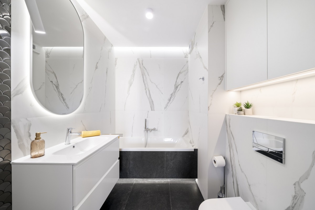 Projekt aranżacji wnętrza mieszkania został wykonany przez warszawską pracownię d. Galerie Venis obecnie Archicom, wykonanie z wysokiej jakości materiałów, markowy sprzęt kuchenny (w zabudowie meblowej chłodziarka z zamrażarką szufladową, kuchnia z płytą grzewczą indukcyjną, okap z oświetleniem, piekarnik, zmywarka Bosch) , zabudowa stolarska pięciu pomieszczeń (dwie sypialnie, przedpokój, dwie łazienki) na wymiar, drzwi wejściowe przeciwwłamaniowe, drzwi wewnętrzne Porta, okna i drzwi balkonowe dźwiękoszczelne trzyszybowe, podłoga panele laminowane odporne na zabrudzenia, łazienki i balkon gres, pralko-suszarka w zabudowie meblowej, lustra w łazienkach podświetlane.