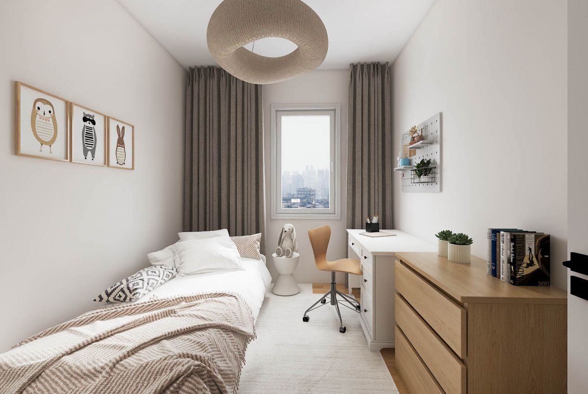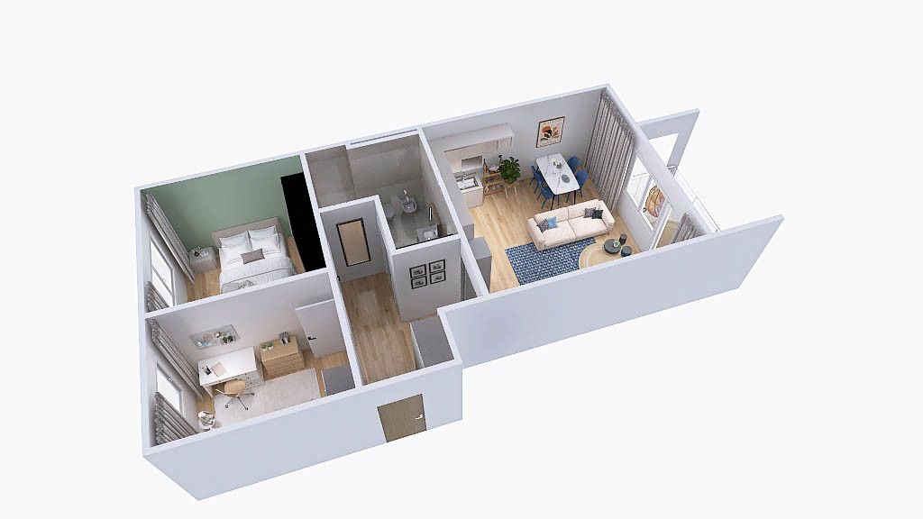 Obecny układ to 2 pokoje i duża, oddzielna kuchnia, którą można z łatwością przekształcić w pełnowymiarowy pokój dla dziecka lub gabinet.